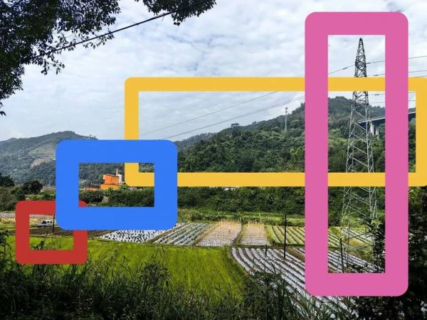 粉色的是高压线,黄色的是高速公路,蓝色的是一个工厂,红色的是一辆拉货小车。