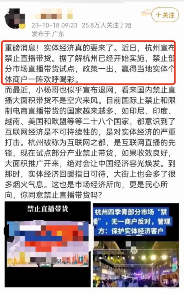 今年3月,杭州四季青市场发布禁止直播公告引发热议。近日,“杭州宣布禁止直播带货。据了解,杭州已经开始实施,禁止部分市场直播带货试点”的消息在网上流传,引发关注。