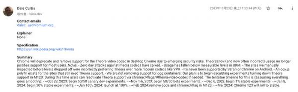 ▲ 图源 Dale Curtis 发布的邮件Dale Curtis 声称,开发者依然会为需要 Theora 支持的网站提供 ogv.js polyfill,且不会删除对 ogg 容器的支持。