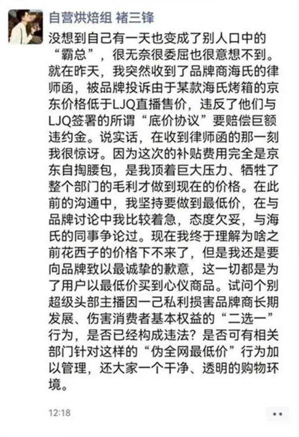 先是京东对李佳琦开火!一名京东采销人员在朋友圈吐槽,自己顶着巨大压力,牺牲部门毛利,申请了京东的平台补贴,把“海氏”烤箱的价格给打了下来,打到了全网最低价。