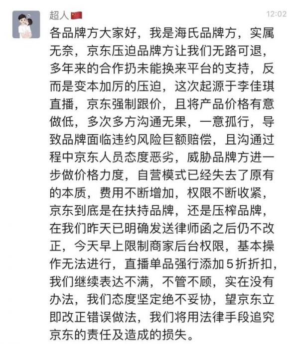 因为“海氏”已经提前跟李佳琦直播间签署“保价协议”,海氏烤箱在其他所有平台渠道的价格都不能高于李佳琦,以确保李佳琦拿到的零售价就是全网最低价。如果京东卖得比李佳琦更便宜,“海氏”品牌将面临巨额违约金赔偿。因此,“海氏”要求京东恢复价格,不得“恶意补贴”。