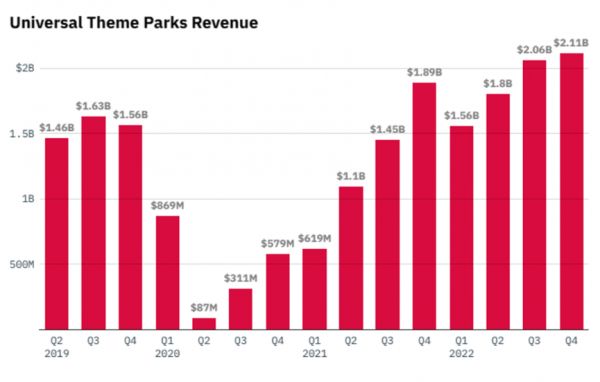 此外,康卡斯特2022年财报数据,或许可以给北京环球影城带来一些信心。2022年四季度,康卡斯特主题乐园业务收入超过21亿美元,同比增长12%,全年主题乐园业务收入超75亿美元,同比增长49%。