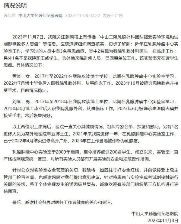11月7日,有自媒体传言,中山大学附属第二医院的乳腺外科研究团队多人罹患癌症。传言语焉不详,但用意和指向很明确,那就是该课题组是做肿瘤方面研究的,传言中多位课题组成员的患癌与其实验室工作有直接关系。传言内容还包括该课题组使用致癌试剂在动物体内建造肿瘤模型,甚至提到课题组负责人事后召集会议并要求尽快从实验室清理掉这些试剂。
