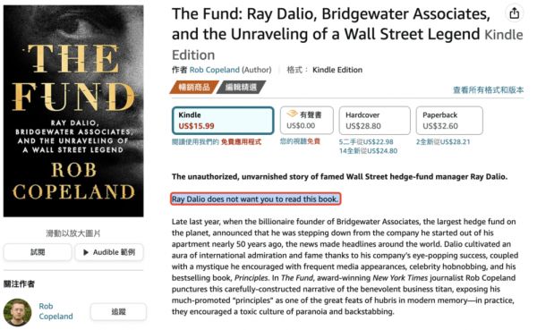 尽管达里奥和桥水曾试图使用“律师函”和数十亿美元的诉讼来应对科普兰阁下的大爆料,但目前此书已经在Amazon上架(笔者亲测也可以在某公益网站下载到此书电子版),介绍页一句“雷·达里奥不希望你读这本书”,勾起了人类最原始的八卦欲。