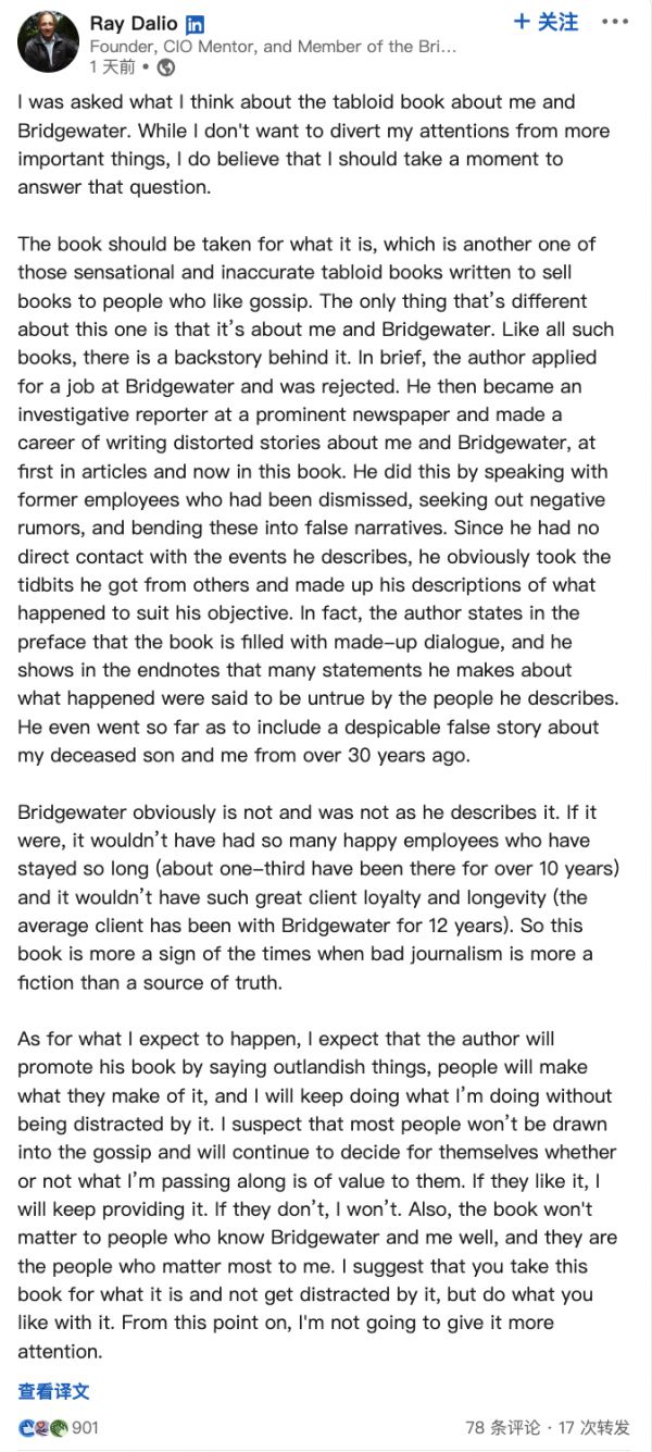 从表态来看,这应该也是达里奥对此书投入的最后一点精力——“我会继续做我正在做的事情,不会被这本书所干扰。”