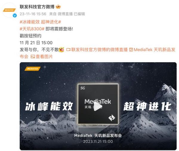上个月联发科发布了新一代旗舰SoC:天玑9300,现在中端次旗舰天玑8系列SoC也要更新了。今天联发科官宣将于11月21日15点发布天玑8300。