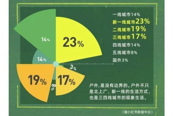 小红书发布的《2023户外生活趋势报告》显示,户外人群中新一线城市占比最高,达到23%;一线城市占比14%,二、三线城市分别为19%、17%;而四线城市与一线城市已经持平;五线城市也占到8%。