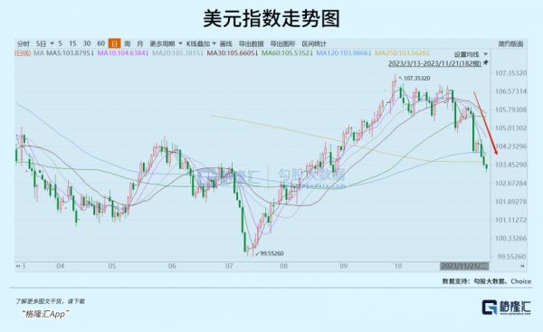 美元指数从11月初的106.6一路狂泻至如今(11月21日)的103.3,累计跌幅高达3.19%。