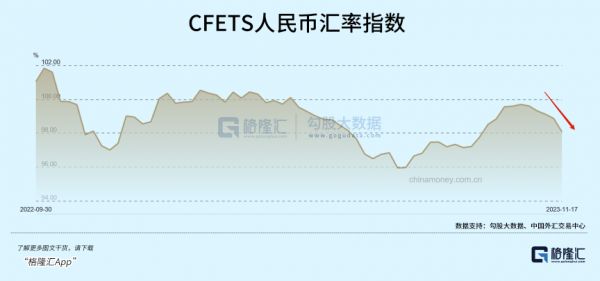 第二,截至11月17日,CFETS人民币汇率指数为98.07,较10月20日的99.69累计下跌1.625%。该指数追踪的是一揽子货币,其权重最大的是美元为26.4%,其次为欧元(21.4%)和日元(14.7%)。此外,还包括港元、英镑、澳元、新西兰元、新元、瑞郎、加元、马来西亚林吉特、俄罗斯卢布和泰铢。