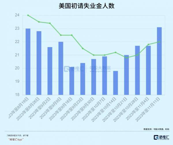上周四,美国劳动部公布数据显示,截至11月11日当周初请失业金人数增加1.3万人,经季节调整后为23.1万人,预期值为22万人。另外,11月4日当周续请失业金人数增至186.5万。该数据升至近两年来的最高水平,凸显出失业工人在寻找新工作时面临越来越多的困难。