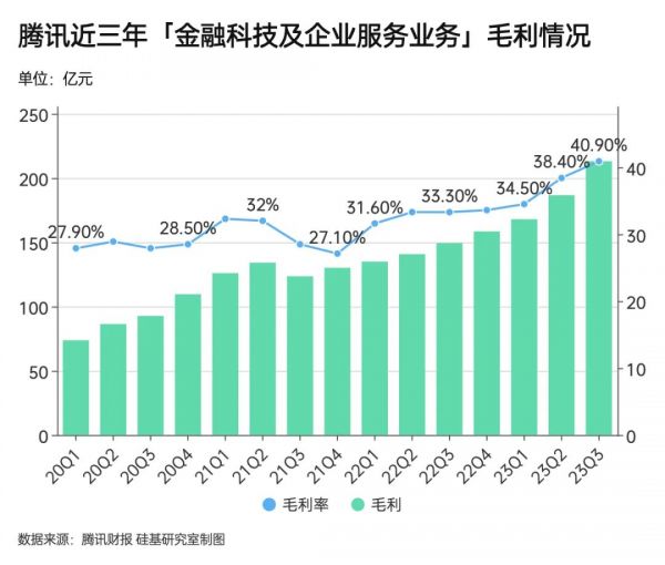 腾讯云也是如此。「硅基研究室」梳理发现,腾讯云所属的金融科技及企业服务业务(以下简称:ToB业务)整体毛利率得到了明显的优化,该业务在2021年Q4毛利率为27.1%,但到2023年Q3,毛利率已上升至40.9%。