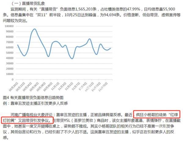 11月22日,中国消费者协会发布“2023年“双11”消费维权舆情分析报告”,报告提到,2023年“双11”期间消费维权问题集中在直播带货乱象、商品质量问题、手机软件广告不良体验、促销价格争议等方面。监测期间,有关“直播带货”负面信息1,565,203条,占吐槽类信息的47.99%,日均信息量55,900条。信息量集中在“双11”前半段,10月25日达到峰值,为94,694条。价格垄断、低俗带货、虚假宣传等问题较为突出。其中提及的一个案例就是疯狂小杨哥的徒弟“红绿灯的黄”带货引发争议。在带货YSL(圣罗兰美妆)商品时,该女主播形象邋遢、表情狰狞,在直播截图中,她甚至一度叉开腿蹲在桌上,姿势颇不雅观。