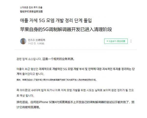 据韩国门户网站 Naver 博客上的新闻聚合账号“yeux1122”运营者称,与苹果公司 5G 调制解调器部门相关的供应链消息人士透露,该公司自主研发调制解调器的尝试迄今都没有成功,苹果公司正在结束这个持续多年的投资项目。另外,爆料者 @Tech_Reve 也表示,从日本的供应链消息人士那里听到了类似的消息。
