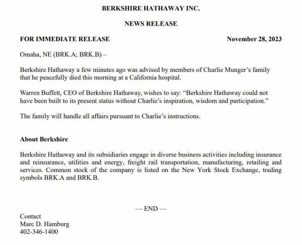 2023年11月28日(当地时间),伯克希尔·哈撒韦在其子公司美国商业资讯网站上发布声明,伯克希尔董事会副主席查理·芒格于当天早上在加州的一家医院安详去世。