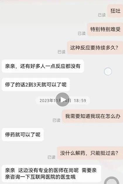 只是她还没有意识到问题的严重性,第一反应是去找网上药店的客服咨询,对方也判断她是不良反应的症状,回复她的信息是:“亲亲,还有好多人一点反应都没有呢,如果忍不了的话您就停药吧,这边没有专业的医师在岗,需要亲亲咨询一下互联网医院的医生哦。”