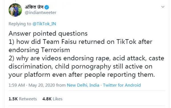 其中在 TikTok 这条推送下最热门的评论指出了 TikTok 在印度运营的痛点:关于强奸、硫酸攻击、种姓歧视、儿童色情、恐怖主义、动物虐待等视频仍然在平台上屡见不鲜。