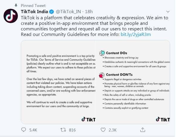 虽然有不少印度人在 Twitter 上发声,但 TikTok 在 5 月 19 日仅仅发布了一条关于社区指南的推送,并没有道歉,显然这并不是印度民众想要的答案。