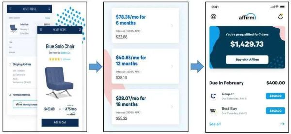 Affirm旨在为无法获得传统信用卡的人提供消费贷款服务。在美国,年轻一代、留学生或者新移民等群体由于没有太多的信用记录无法在传统金融机构申请信用卡,在日常的购物消费生活中缺少了许多便利。Affirm不需要客户提供信用评分,只需要客户的姓名、手机号码、社保号码等基本信息便可在几秒内对客户进行贷款审批。它的操作很便捷,消费者在购物页面结账的同时便可完成贷款的申请发放。