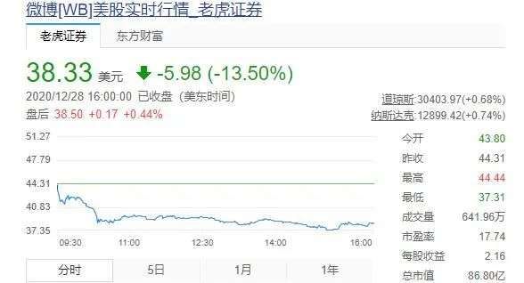 北京12月29日凌晨4时,微博一度暴跌愈15.70%,至收盘暴跌13.50%,每股重挫5.98美元,至38.33美元,总市值87亿美元。相比年初时52.33美元的纪录高点,今年以来已下跌了四分之一。