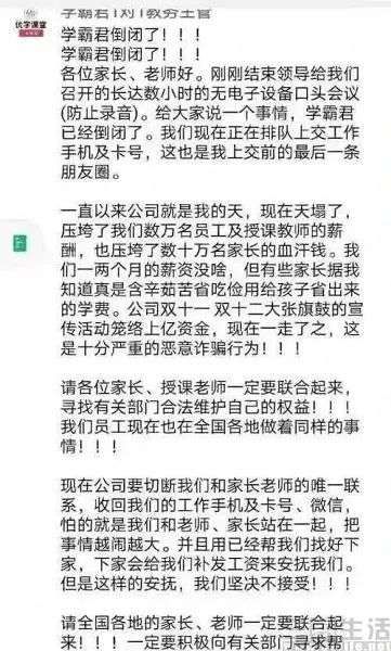 到了12月,网 传的一张疑似学霸君1对1教务主管的朋友圈截图称,“学霸君已经倒闭了”。而这是目前在线教育领域“跑路风波”中知名度最广的第一个平台,其创立8年来共经历过6轮融资,估值一度曾达到10亿美元。