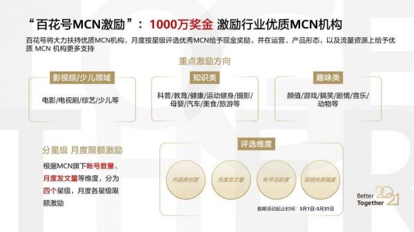 因此,华为视频将从5月1日开始正式启动“百花号MCN激励”计划,将在一年内面向优质MCN机构以及旗下达人提供千万现金奖励。