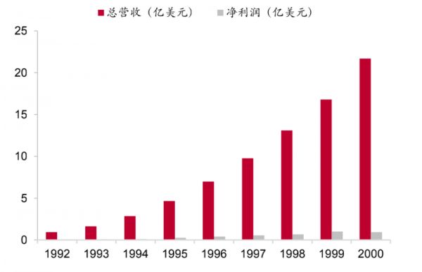 图:1992年~2000年星巴克营收和净利润(来源:公司公告、中泰证券研究所)