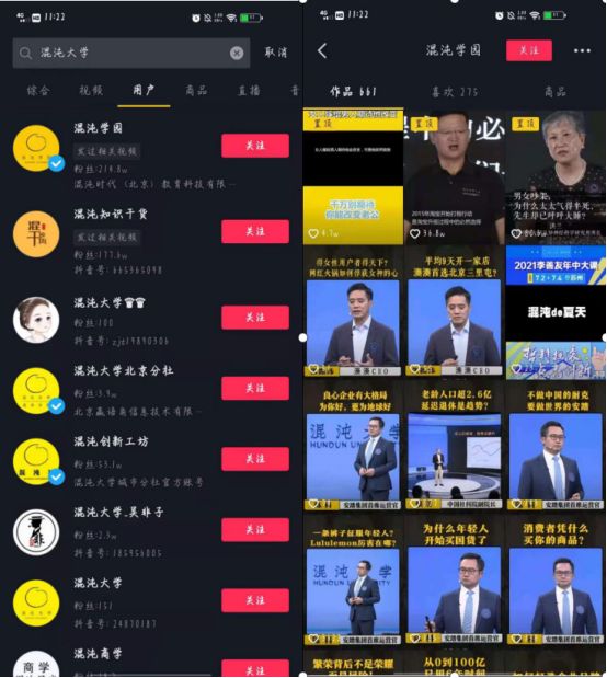 不止于此,一些职场及创业人士想要“解困”涌入了混沌大学以及思维造物公司旗下“得到”APP内。在抖音上,混沌学院的粉丝数已达到241.8万,单条短视频内容也能有上万的点击量;得到粉丝数也达到了13.9万。