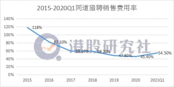 但值得注意的是,猎聘营收能够在今年一季度实现超50%的增长,其实很大一部分的原因是由于去年同期对比基数较低。同时,在营销费用上的投入也起到了一定推波助澜的作用。数据显示,2021Q1其销售费用达到了2.85亿,总营收占比达54.5%,而这个数字在2020年仅为45.4%。