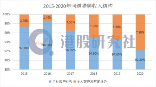 在财报数据中也展示了猎聘的企业客户的依赖,2020年猎聘来自企业用户的收益为17.23亿元,来自个人用户的收益为1.44亿元,企业用户收益占比高达92.2%。虽然自2016年来,个人用户及其他业务收入占比在不断提升,但主要收入还是依赖于企业客户业务,这于猎聘专注于高端市场的战略是分不开的。