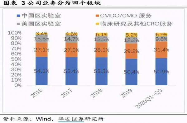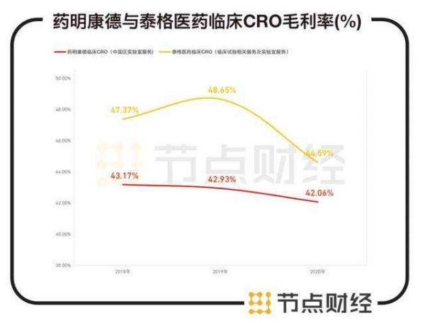 2018年至2020年,其临床CRO(中国区实验室服务)的毛利率分别为43.17%、42.93%、42.06%,持续下滑。且其CRO业务还要低于与其对标的泰格医药,上述期间,泰格医药临床CRO(临床试验相关服务及实验室服务)的毛利率分别为47.37%、48.65%、44.59%,各年均高于药明康德。