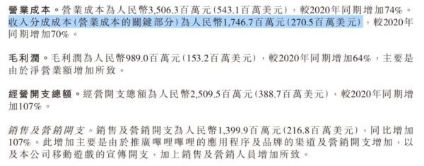 当然,B站在营收上的努力,也是付出一定代价的。这表现在两个方面:一个方面是经营开支的增加,其中本季销售及营销开支达到了14亿元,同比增加107%,主要是由于推广B站的应用程序及品牌的渠道及营销开支增加,以及移动游戏的宣传开支,加上销售及营销人员增加所致。而这也直接导致B站亏损幅度迅速扩大。