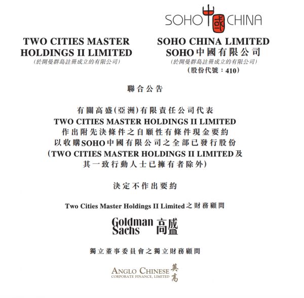 9月10日,SOHO中国发布公告称,黑石集团决定不就收购公司股权做出要约。