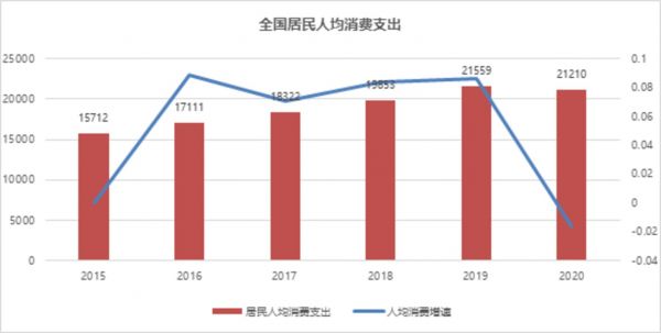 而去年一整年全国居民人均消费支出水平相对于2019年是下降状态,虽然去年整体人均收入是增长的(扣除价格因素,实际增长2.1%)。同时,2020年全国社会消费品零售总额同比下降3.9%。这也是近20年在高速发展过程中首次出现下降。