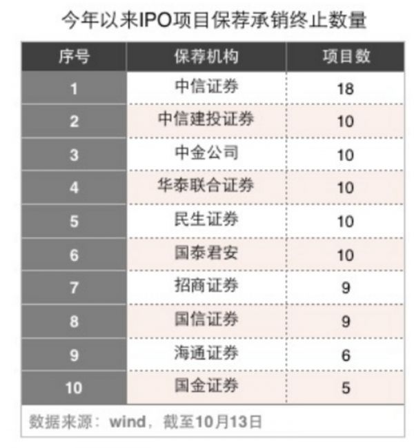 不仅是中金公司,很多券商都遇到了IPO保荐项目终止的情况。根据wind数据统计,截至10月13日,今年以来,中信证券保荐承销终止项目达到了18个,而中信建投、中金公司、华泰联合证券、民生证券、国泰君安等均为10个,招商证券、国信证券有9个。
