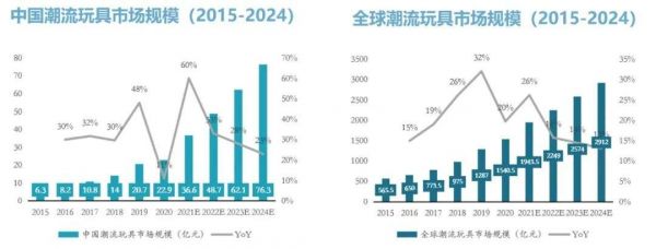 数据也显示,中国潮玩市场整体市场规模由2015年的63亿元增加至2020年的229亿元,5年CAGR为29.45%;2024年市场规模预期将达到763亿元,2019-2024年5年CAGR预计为29.81%,增长势头将继续保持。当下中国潮玩行业已迎来用户红利和IP红利的滋养。