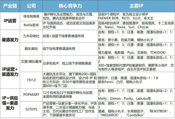 IP运营+供应链+渠道发力 代表企业:奥飞动漫、POP MART、SIDESHOW、52Toys等