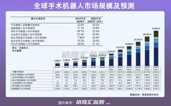 正因如此,手术机器人市场规模呈现快速增长的态势。弗若斯特沙利文数据显示,全球手术机器人市场由2015年的30亿美元增长至2020年的83亿美元,年复合增长率达22.6%,预计将以26.2%的年复合增速增长至2026年的336亿美元。