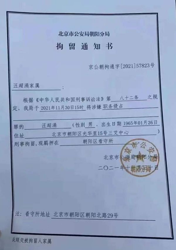 网传这份来自北京市公安局朝阳分局拘留通知书显示,汪潮涌主要涉嫌职务侵占罪。