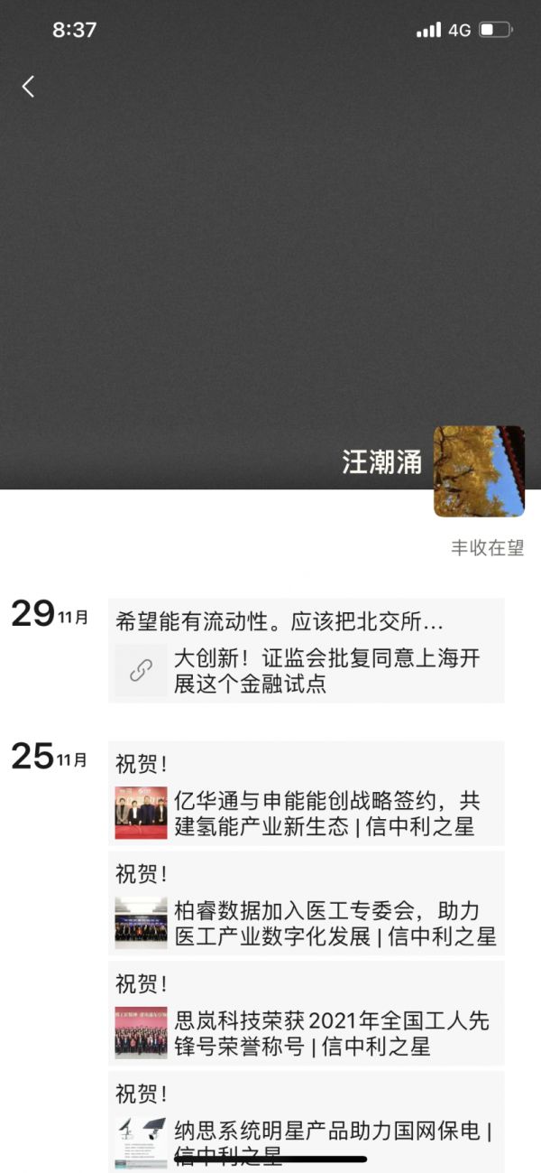 巧合的是,汪潮涌的微信朋友圈也停留在了两周之前的11月29日,内容为“希望能有流动性,应该把北交所的平台用起。”