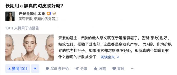比如,在“长期用A醇真的对皮肤好吗?”的知乎提问下有一则回答,一共获得了1436个收藏、1011个点赞、373个喜欢和308个评论。这则回答很好的诠释了何谓专业的知识解答,让许多网友直呼,深入剖析了A醇的前世今生,以及品牌方的A醇研发能力及历史。
