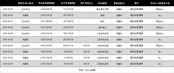 毛国华的减持分为个人持股减持以及通过石头时代这个员工平台进行减持。根据Choice数据,2021年,毛国华累计减持10次,累计减持239.41万股,占公司总股本3.58%。