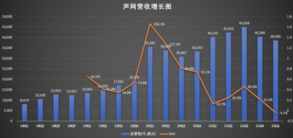 从财报披露的数据看,声网季度营收规模保持增长,但增速有所放缓。财报显示,2022年Q1声网实现了3859万美元的总营收,同比减少4%。这是声网上市以来首次录得季度营收同比负增长。