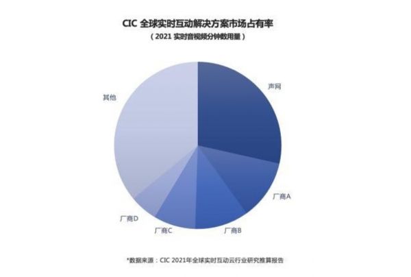 根据独立第三方行业研究与分析机构CIC灼识咨询发布的《2021年全球实时互动云(RTE-PaaS)行业研究报告》(以下简称“报告”)显示,声网继续蝉联全球实时互动解决方案市场份额第一,根据2021年实时互动解决方案支持的实时互动音视频分钟数及年度营收两个指标计算,声网的全球市场占有率均遥遥领先其他服务商。