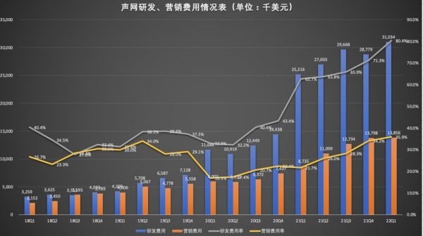 亏损背后与高额的费用支出有着很大的关系。作为技术属性的公司,为加固企业技术护城河,需要持续加大研发投入,以确保满足和提升客户服务体验。财报显示,2022年第一季度,声网研发费用为3103万美元,同比增长23.1%,研发费用率从上年同期的62.7%,上升至80.4%;本季度营销费用同比增长58.6%至1386万美元,营销费用率从上年同期的21.7%,上升至本季度的35.9%。