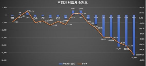 一直以来,声网被诟病的就是其盈利能力。财报显示,2022年一季度,声网净亏2694万美元,已经连续7个季度亏损,净亏损率从上年同期的36.5%扩大至本季度的69.8%。