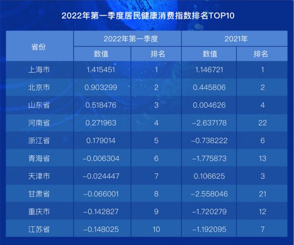 排名方面,上海市居民健康消费指数在31个省(区、市)中继续排名首位(与2021年度相同),排在第二至第十位的依次是北京、山东、河南、浙江、青海、天津、甘肃、重庆和江苏。其中,河南、青海、甘肃和重庆在今年一季度首次进入居民健康消费指数排行前十。河南省居民健康消费指数排名上升最快,从去年的第二十二位上升至第四位。