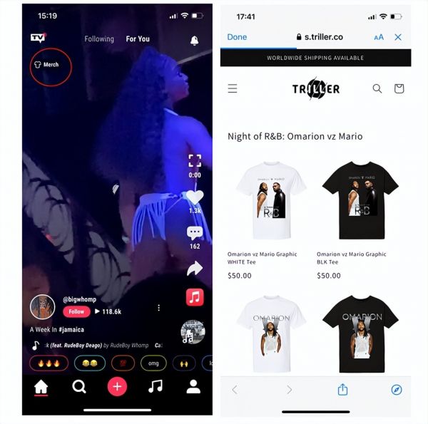 从内容到 App 设计,决定了 Triller 的商业模式。在 TikTok 大举发力的电商业务上,Triller 没有过多布局,目前在主页界面的左上角,Triller 添加了一个“Merch(周边)”标签,会售卖一些 Triller 上知名音乐家的周边产品。其在电商上的路线,其实更类似于 Netflix。