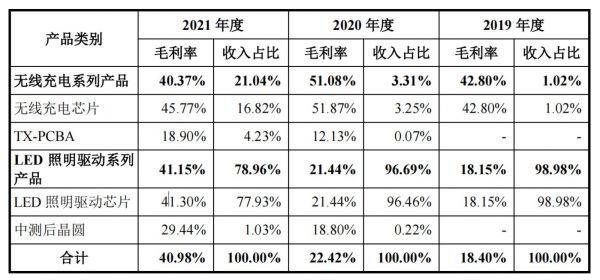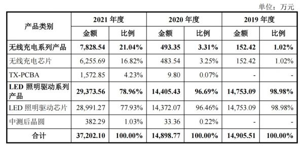 美芯晟是一家Fabless模式的芯片设计企业,主营产品为LED照明驱动系列和无线充电系列两部分,目前LED照明产品收入占比最大,接近80%,不过在2021年之前,此业务占比均在95%以上。