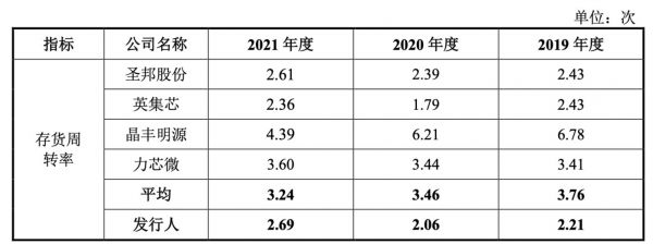 然而,美芯晟的产品竞争力可能不及公司陈述的那么强。从存货周转率中也可见一斑,报告期内,其存货周转率与同行可比公司有一定差距,2019-2021年公司存货周转率分别为 2.21、2.06和2.69,行业均值为3.76、3.46和3.24。