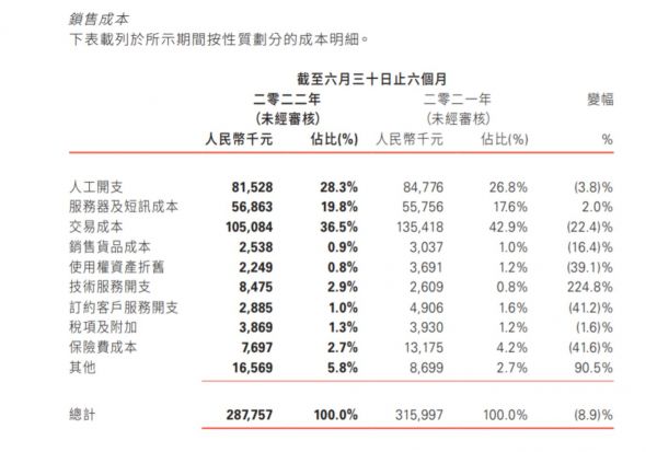 在中国有赞的销售成本中,交易成本占比最多,其次为人工开支。2022年上半年,公司交易成本为1.05亿元,同比减少22.5%;人工开支为8152.8万元,同比减少3.8%。